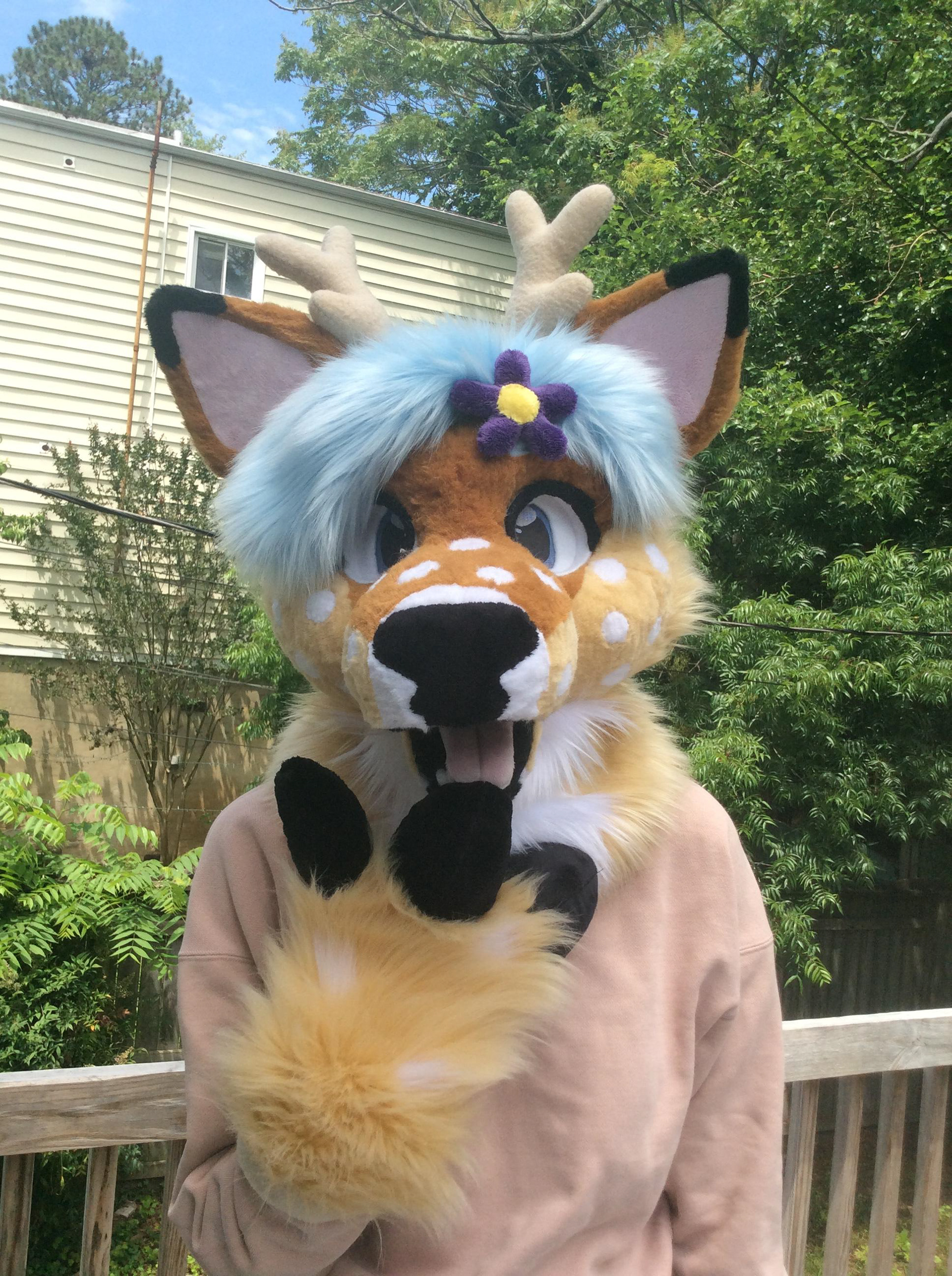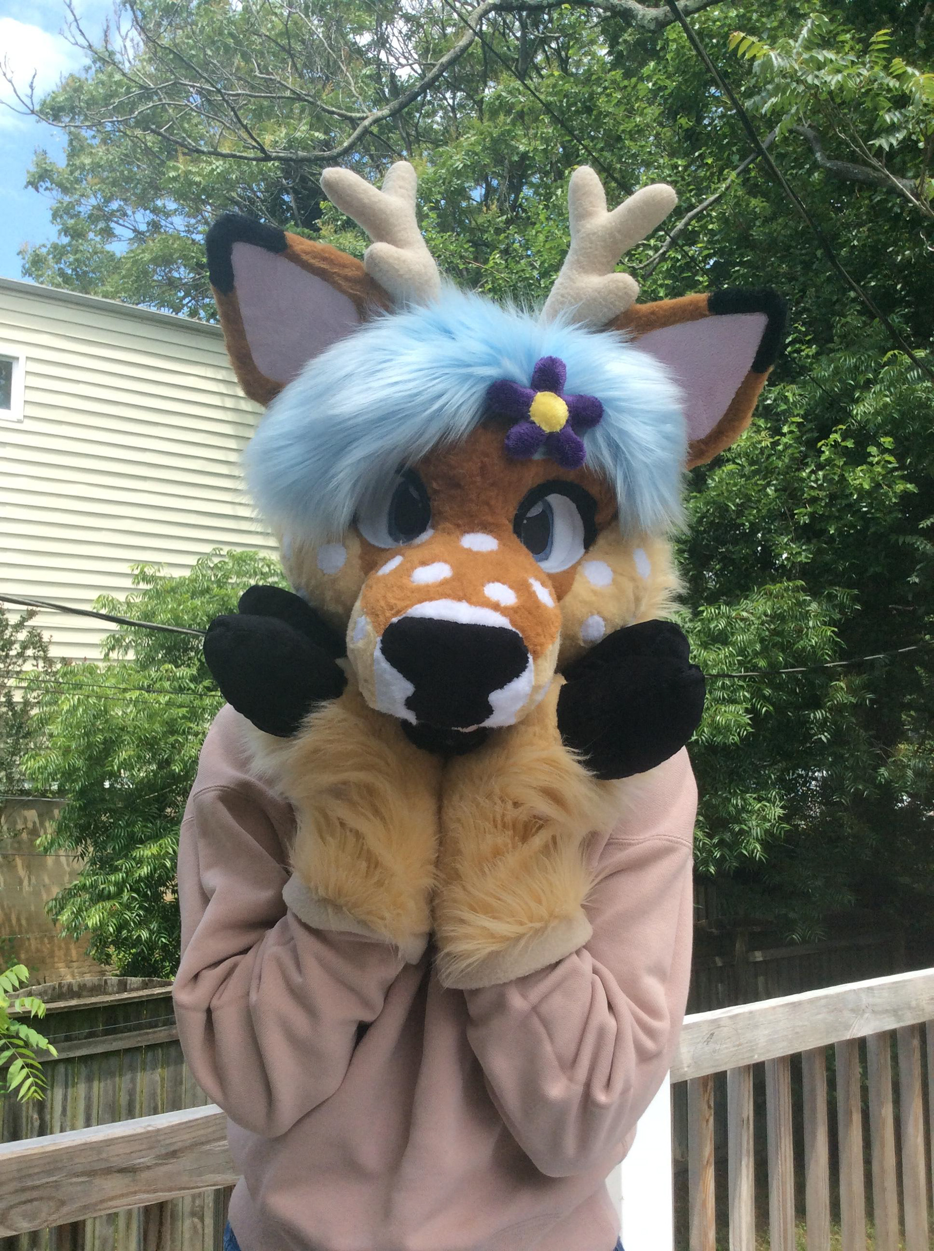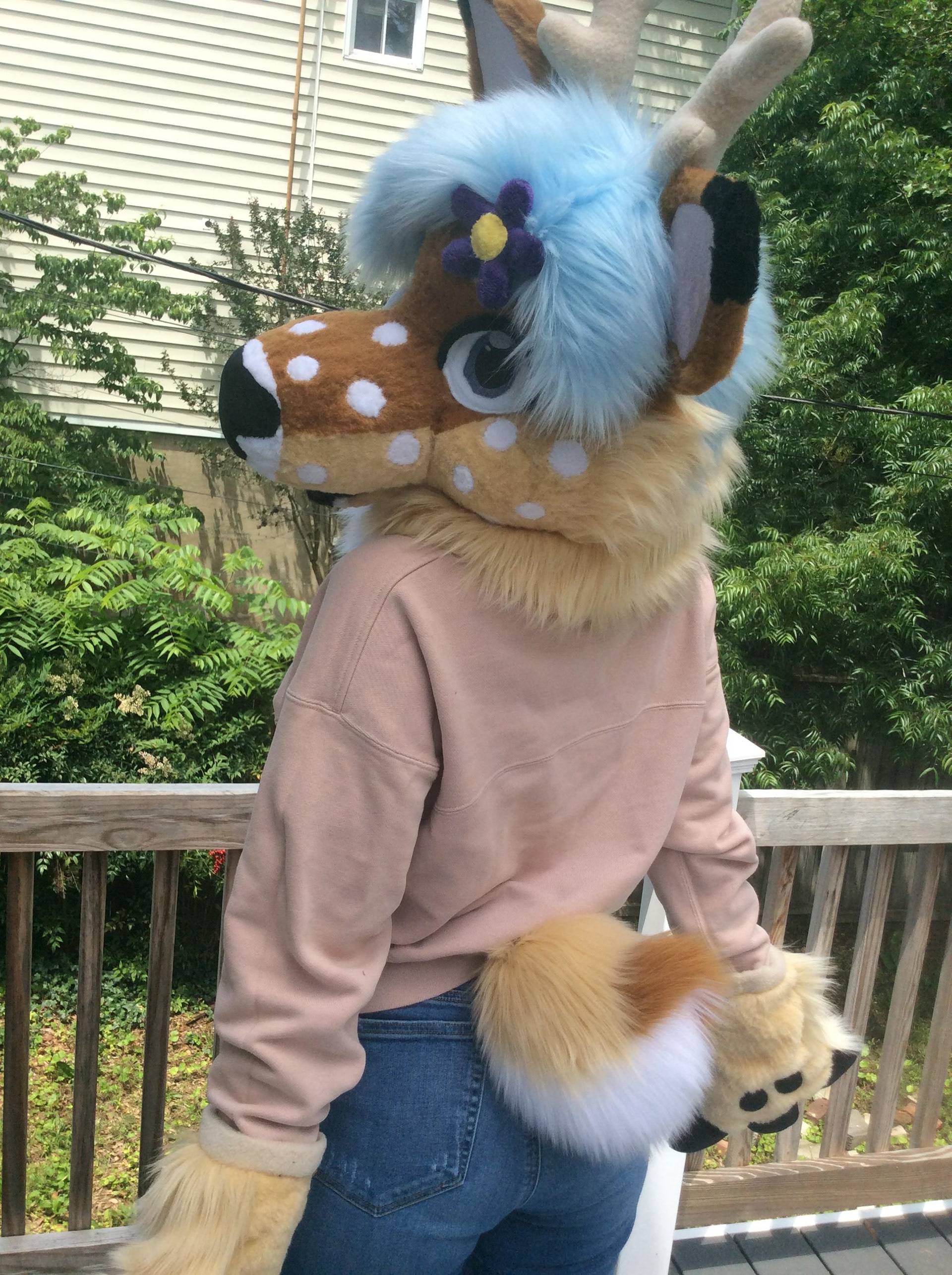 Ari the deer is a full partial commission that includes 3-D eyes, Velcro tongues, a flower pin accessory, and armsleeves! Completed in June, 2020.