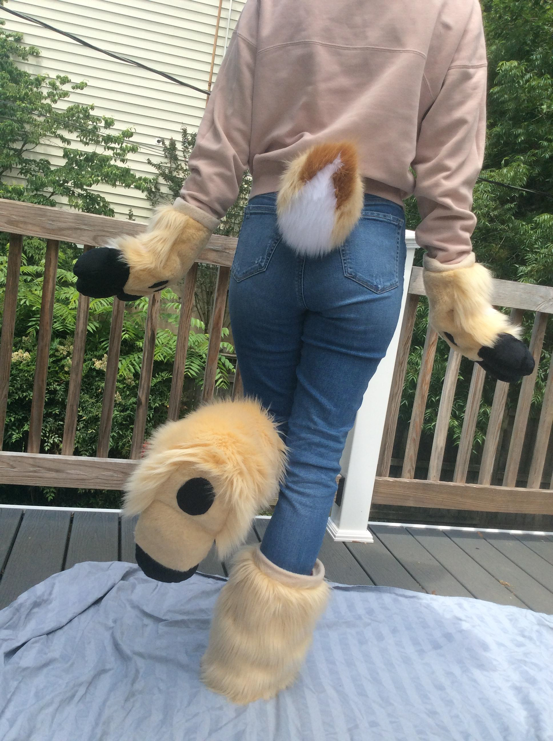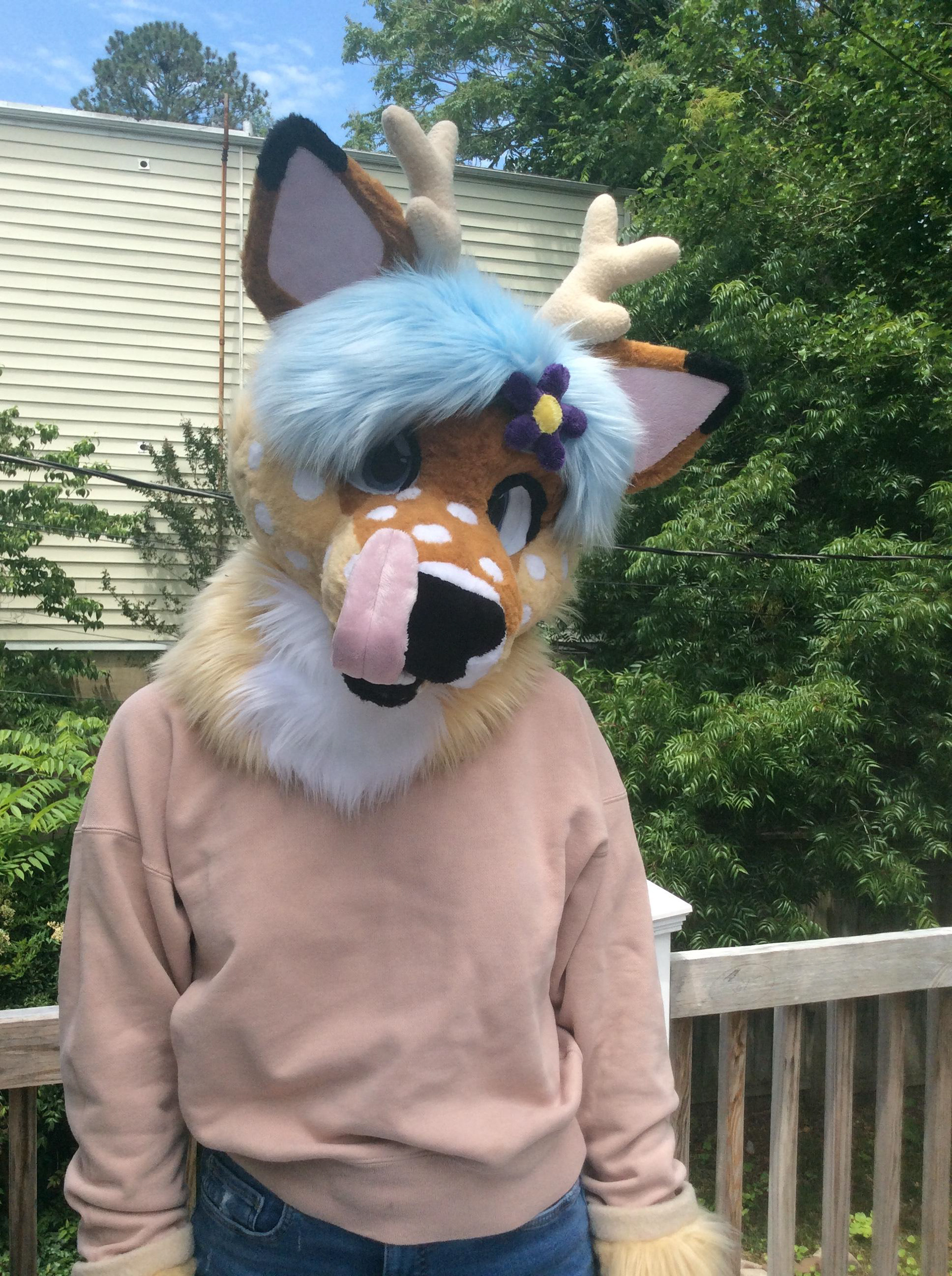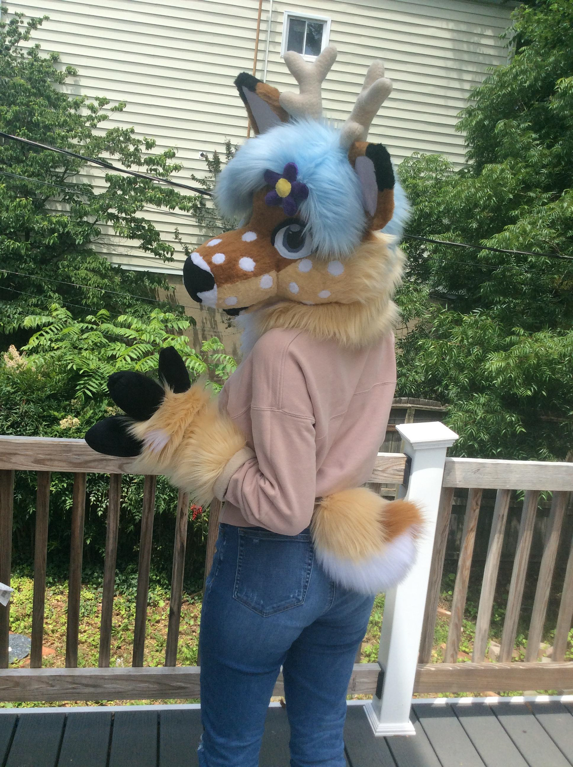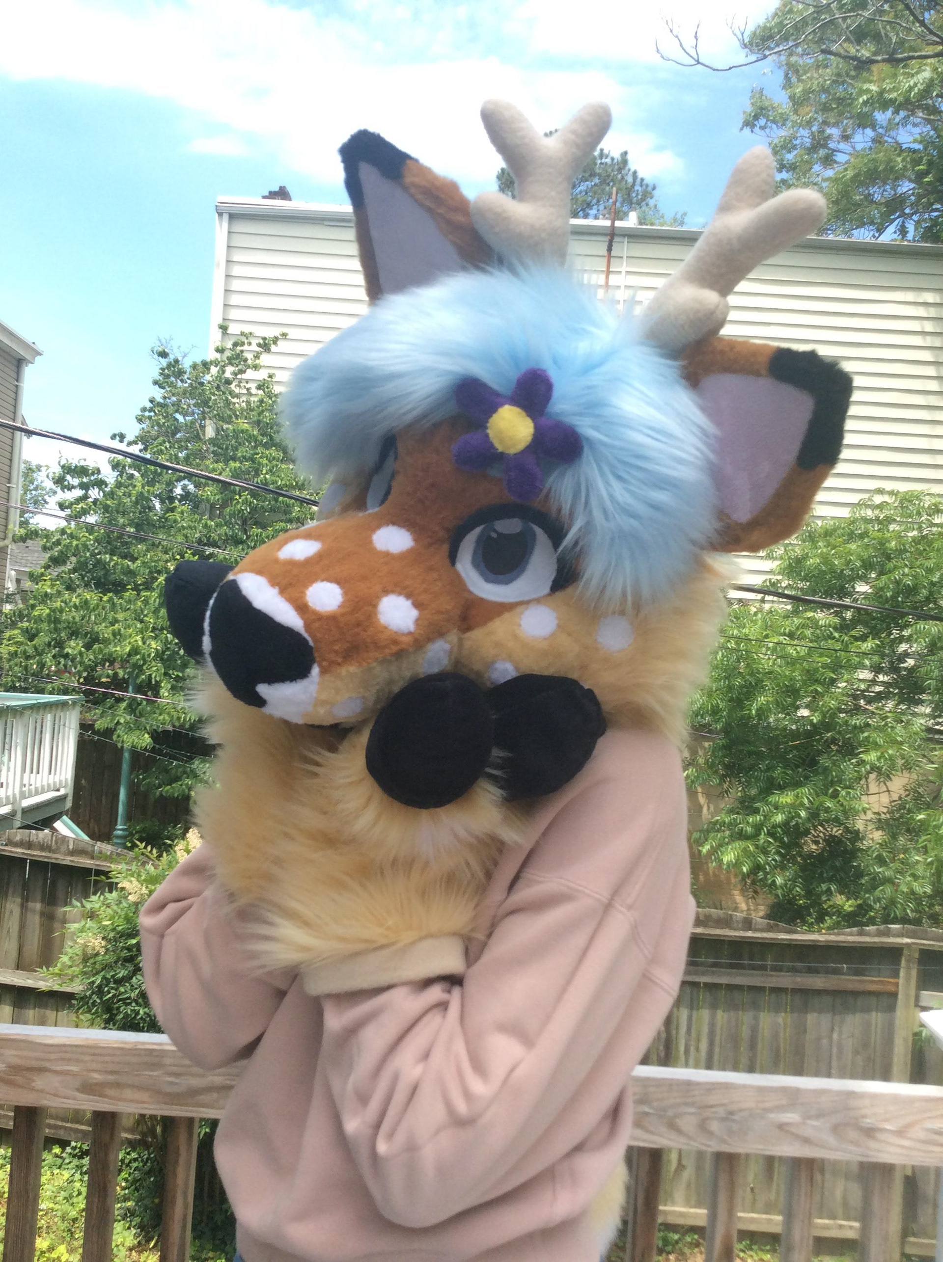 Ari the deer is a full partial commission that includes 3-D eyes, Velcro tongues, a flower pin accessory, and armsleeves! Completed in June, 2020.